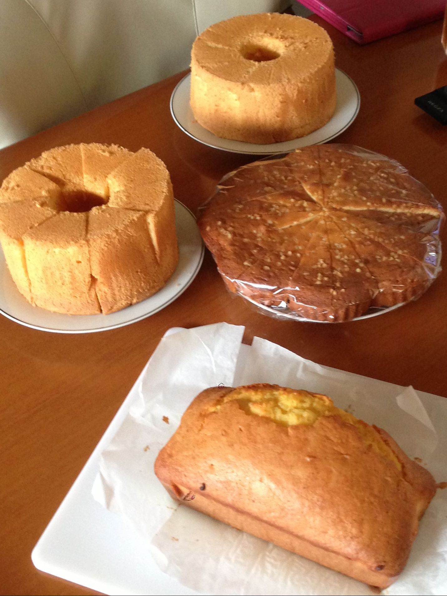 奥のはお持ち帰り用にしたし、手前3つでは……いやでも、18センチシフォンに22センチタルト型バターケーキに28センチのパウンド型卵ケーキですよ。
